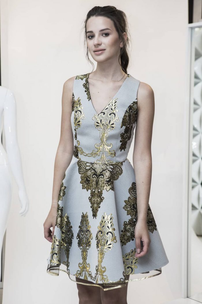 שמלת סקייטר אפורה עם עיטורי בצבע זהב.