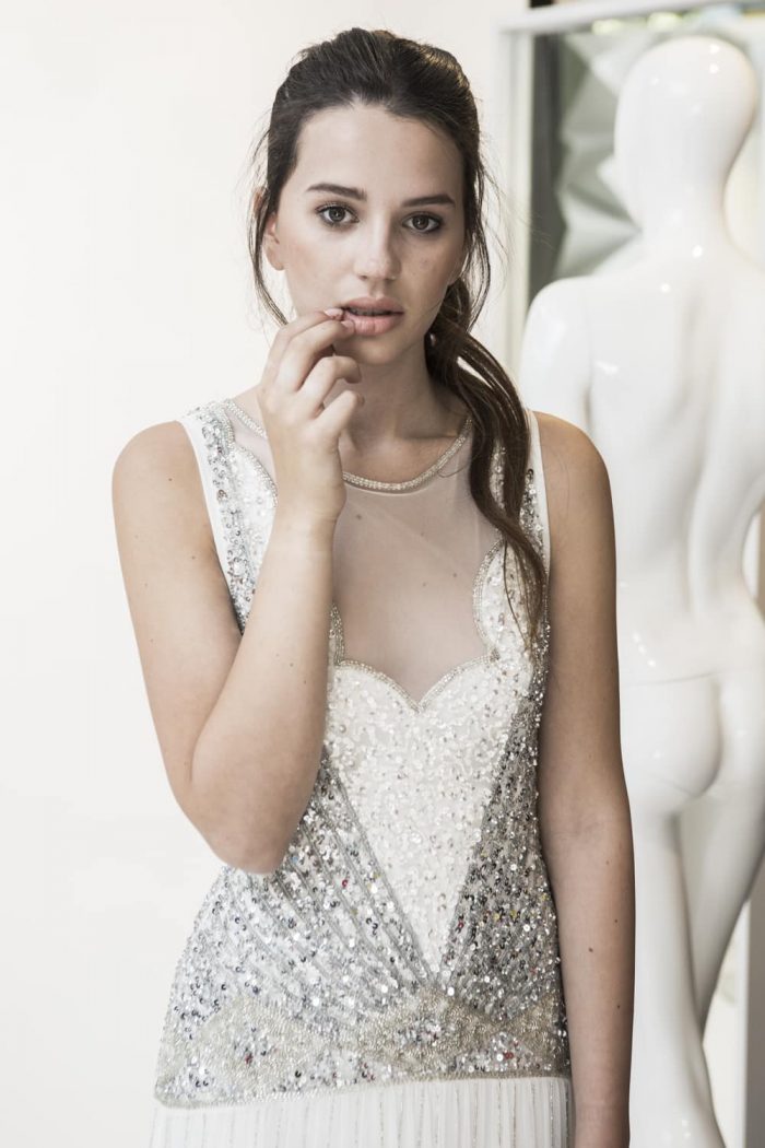 להפוך למרכז האירוע ולמשוך את תשומת הלב של הקהל, עם שמלת ערב מרהיבה! בשמלה נגיעות של פייטים בצבע כסף וחרוזים מזכוכית בעבודת יד.